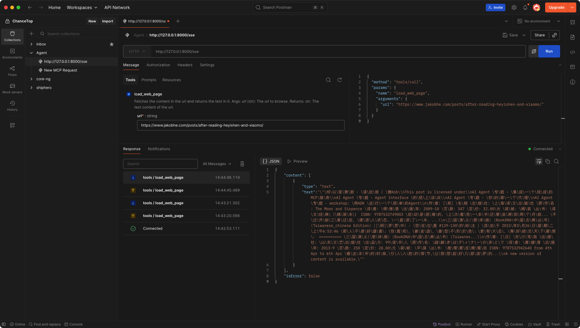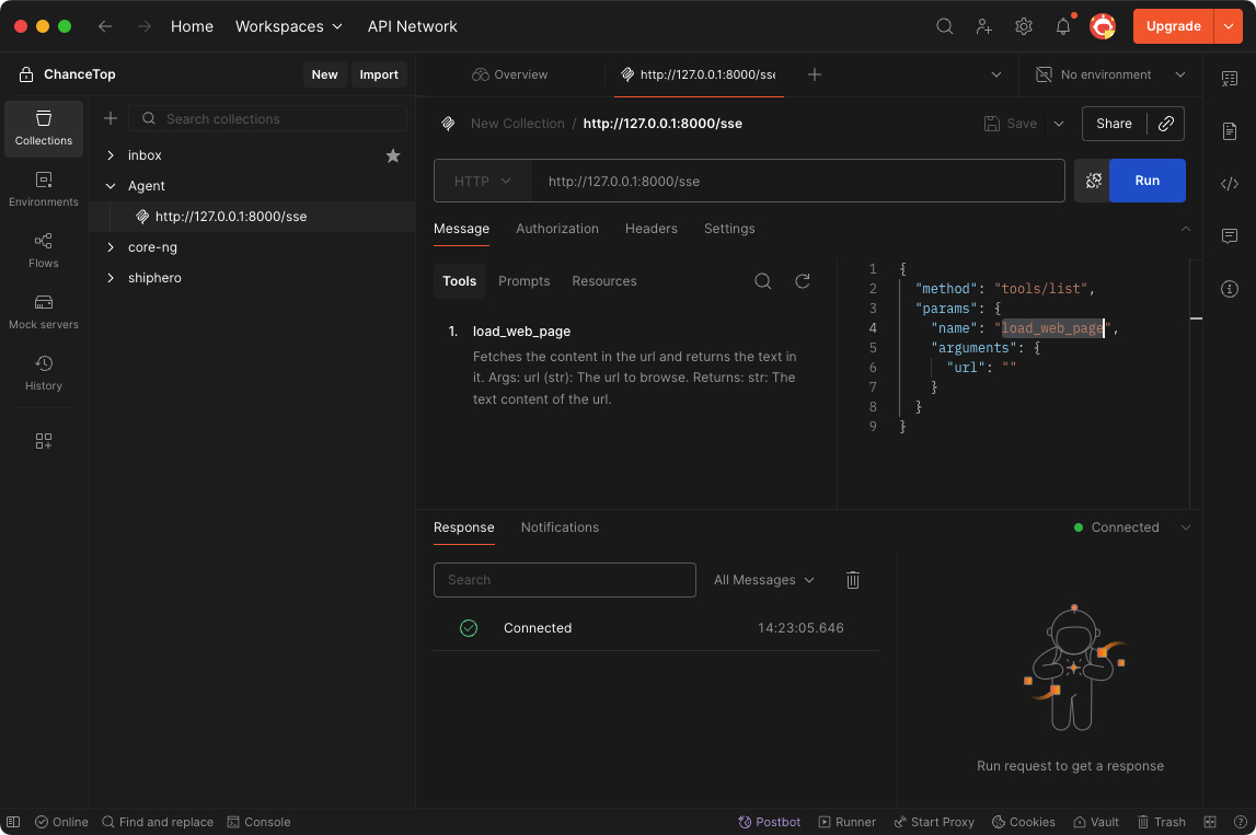 请求我们的mcp 服务之后,就能拉到所有的tools。点击tool就能执行tool。